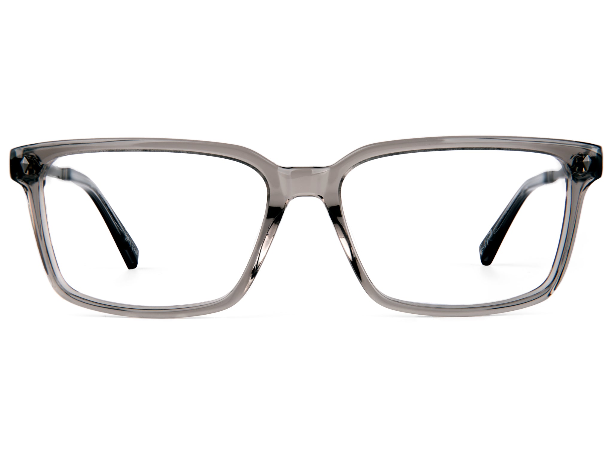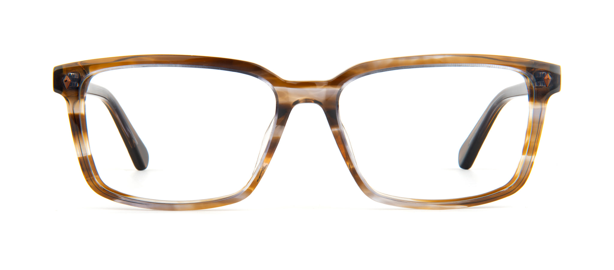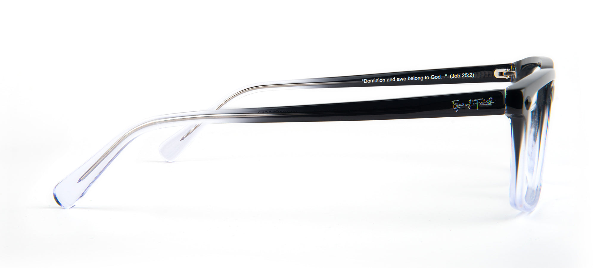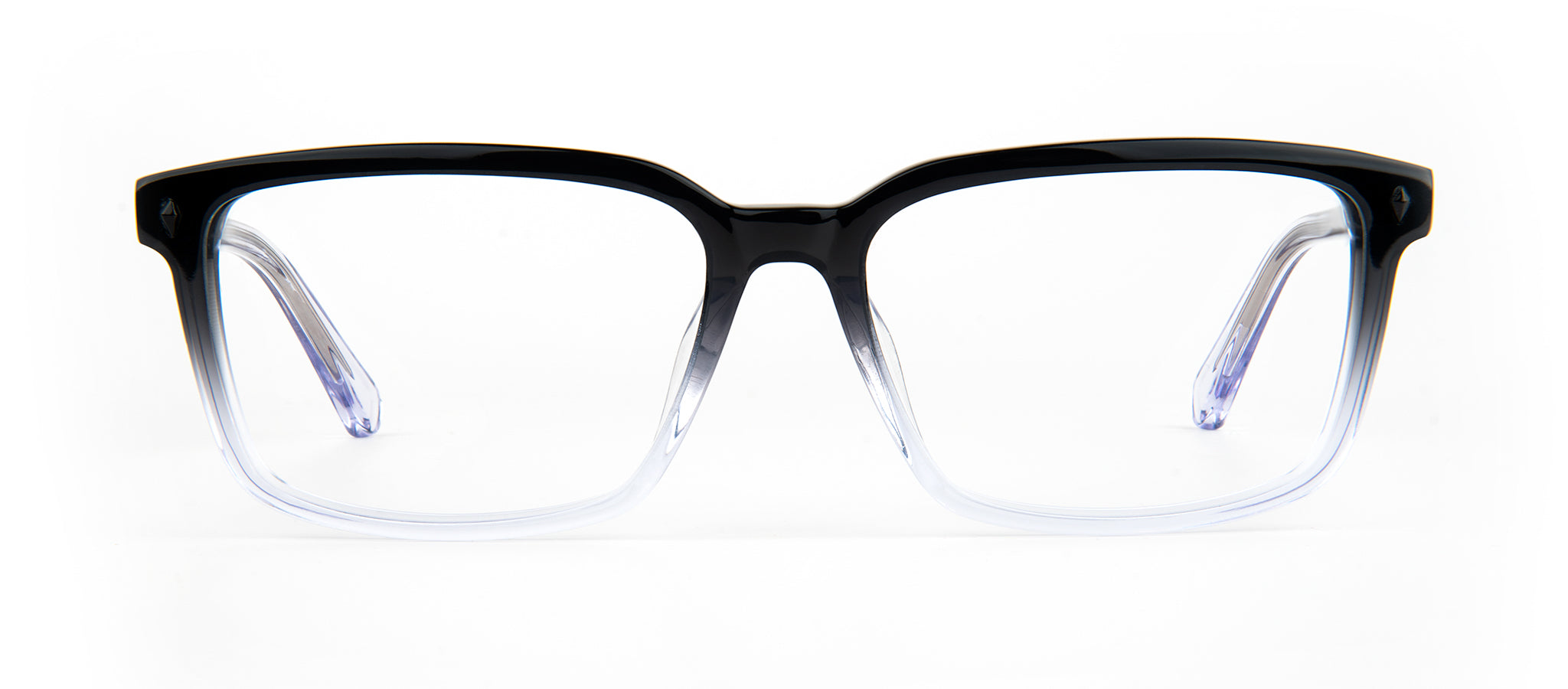 - Bold, geometric shape with custom beveled temples and laser-etched metallic logo