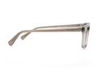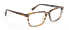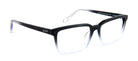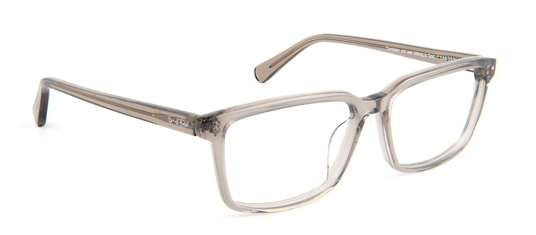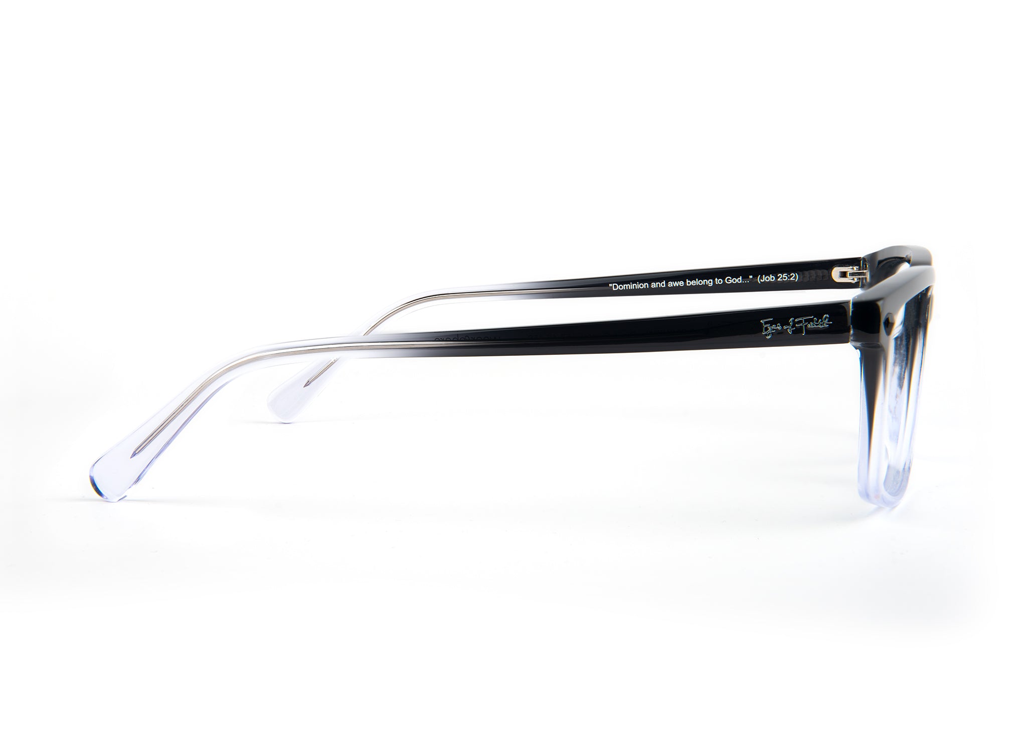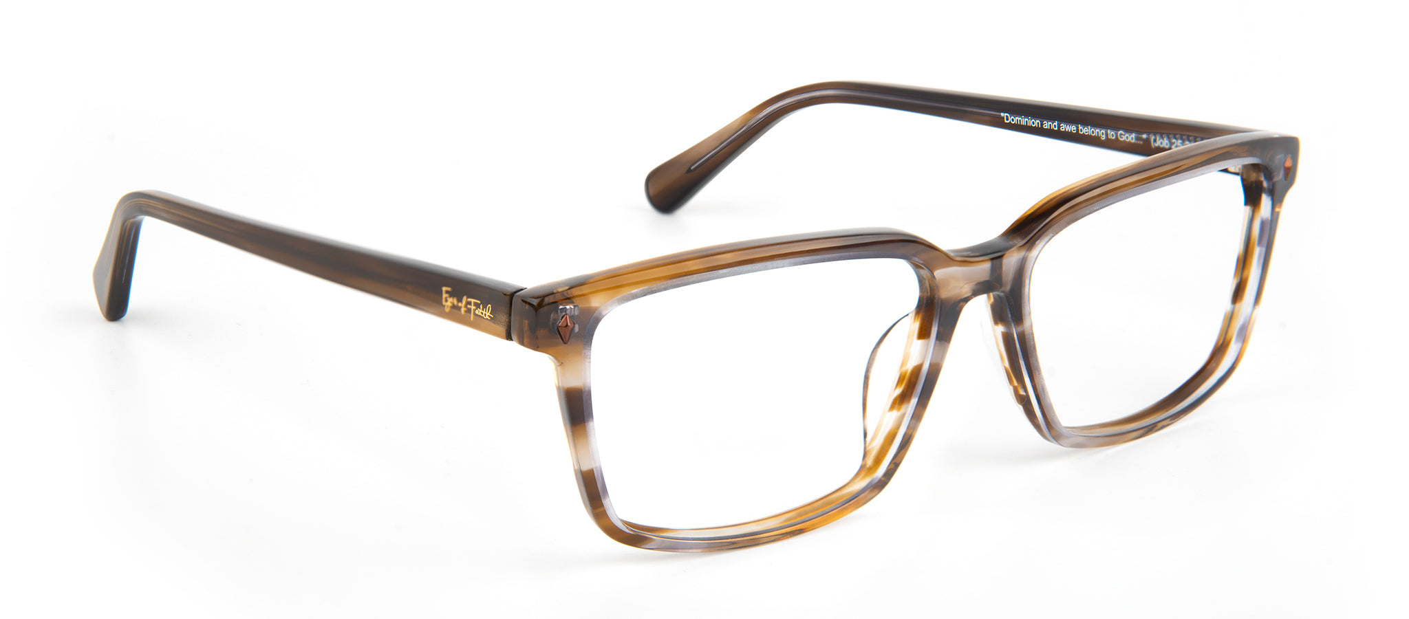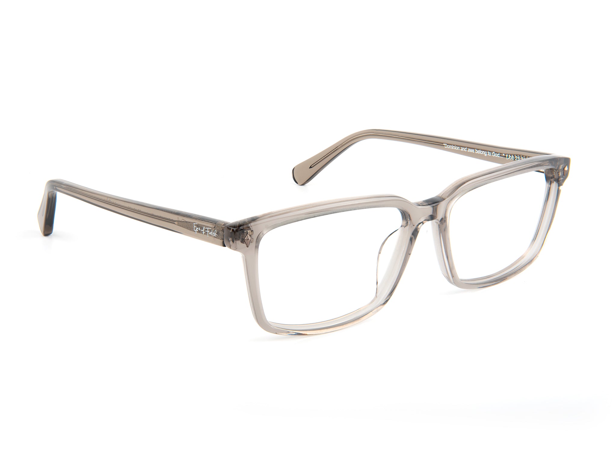 - Bold, geometric shape with custom beveled temples and laser-etched metallic logo